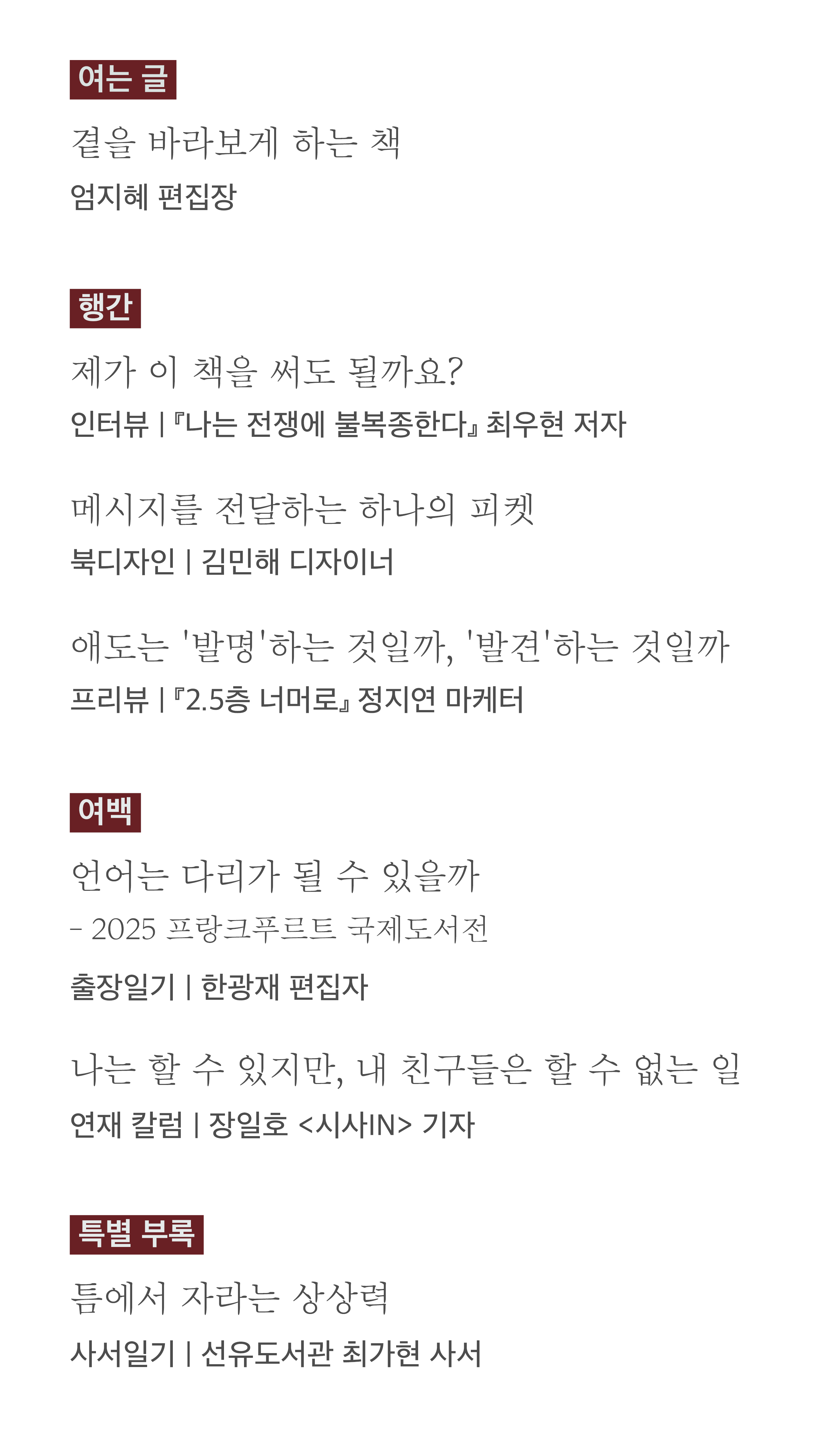 <돌베개 북 매거진> No.16. ‘행간’에서는 『나는 전쟁에 불복종한다』의 최우현 저자 인터뷰와 김민해 디자이너의 표지 디자인 후기, 정지연 마케터의 『2.5층 너머로』 프리뷰를 전합니다. ‘여백’에서는 한광재 편집자의 ‘2025 프랑크푸르트 국제도서전’ 출장기, 장일호 <시사IN> 기자의 그 누구도 누락시키지 않겠다는 다짐, 그리고 특집 부록으로 선유도서관 최가현 사서 인터뷰를 담았습니다.